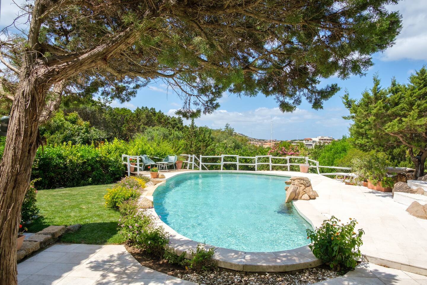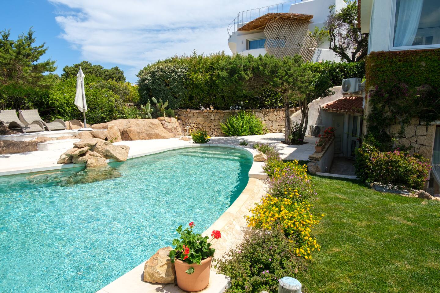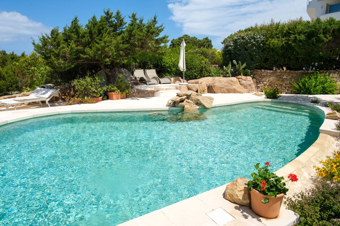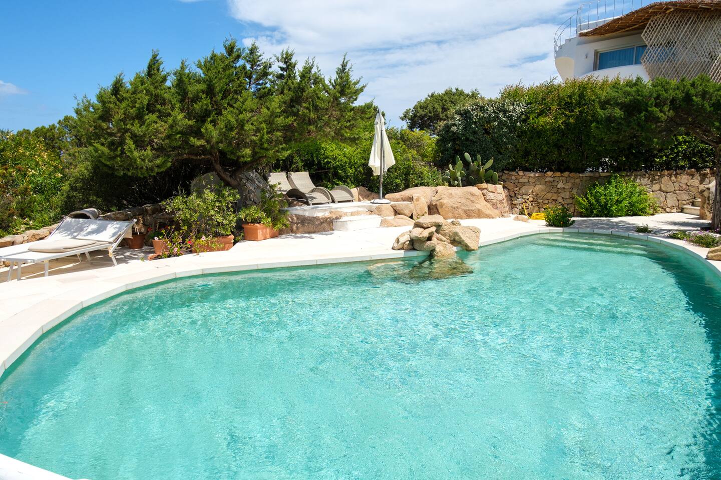 Dal giardino, scendendo dei gradini si accede alla bella piscina privata, circondata dal verde e attrezzata con comodi lettini prendisole per godere in pieno relax il meraviglioso sole della Sardegna.