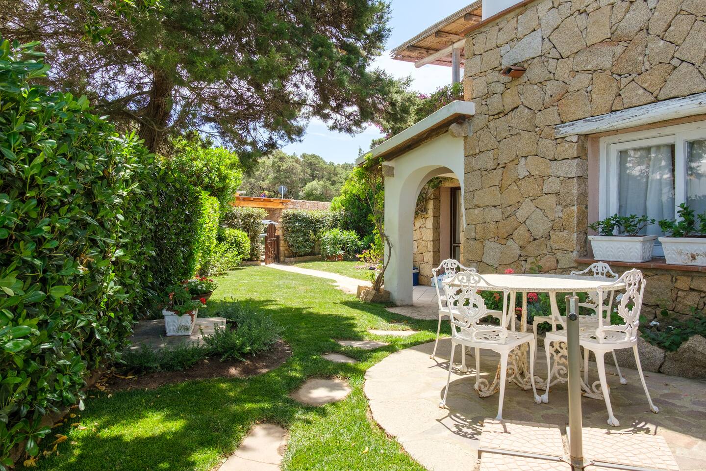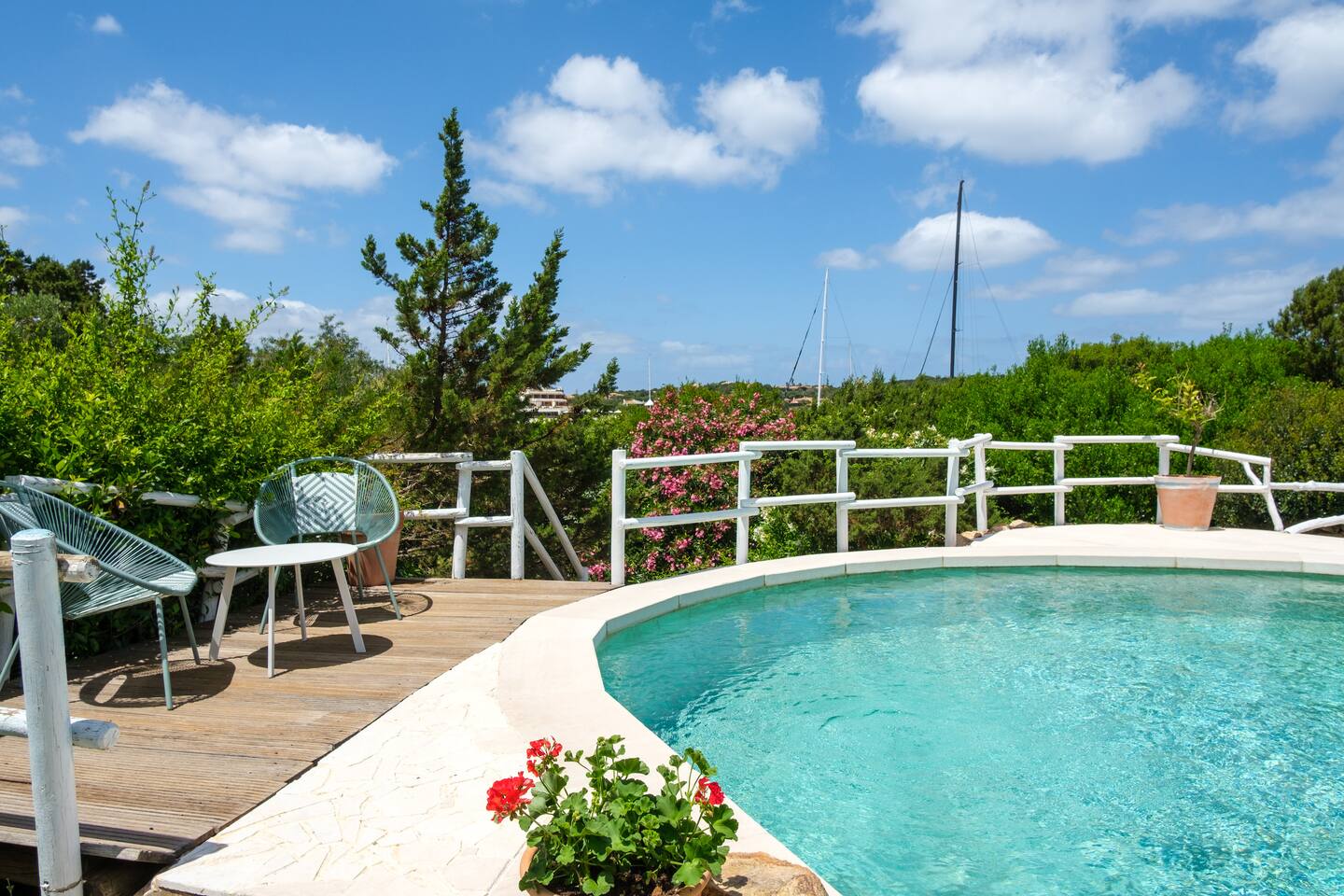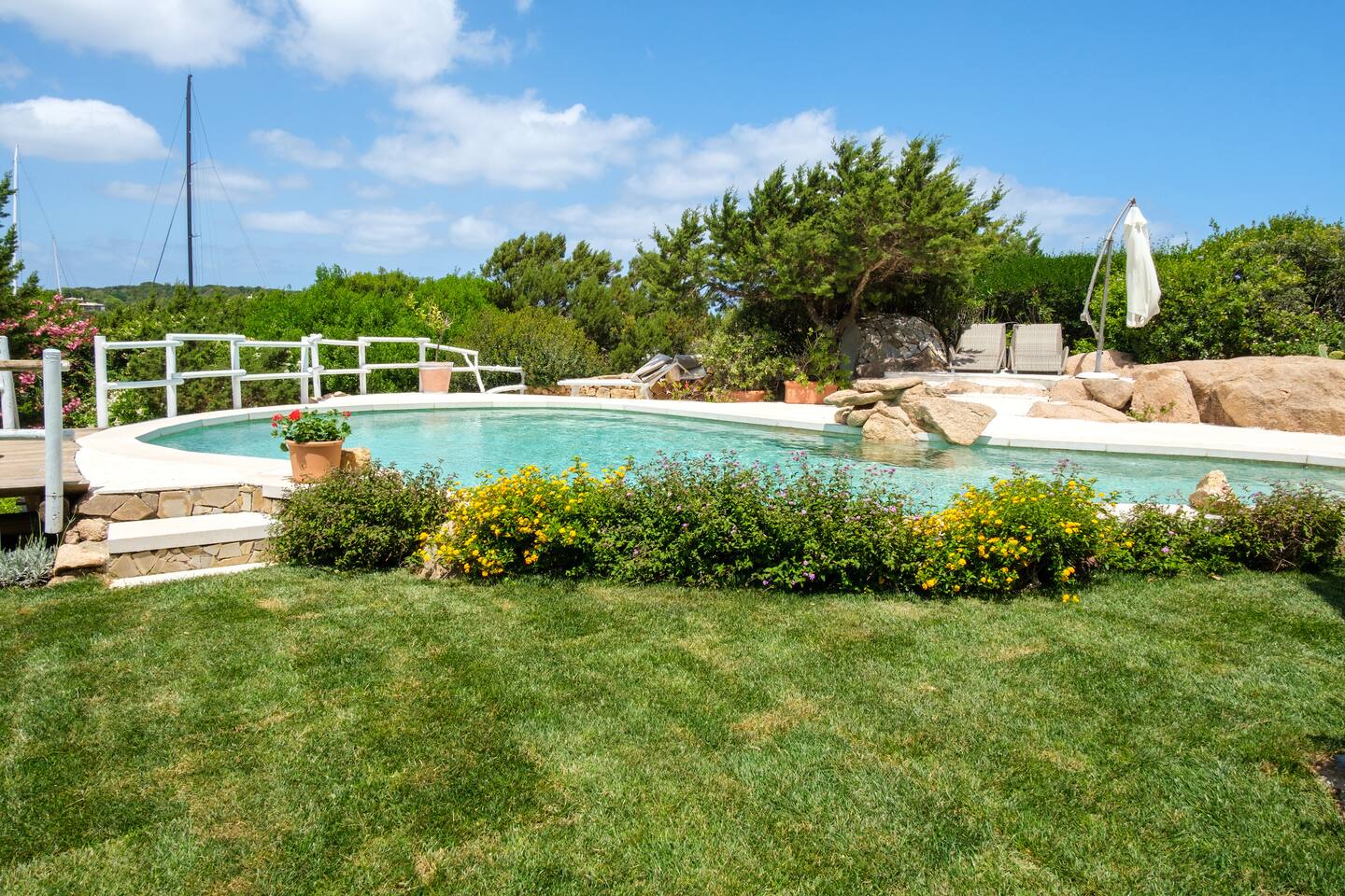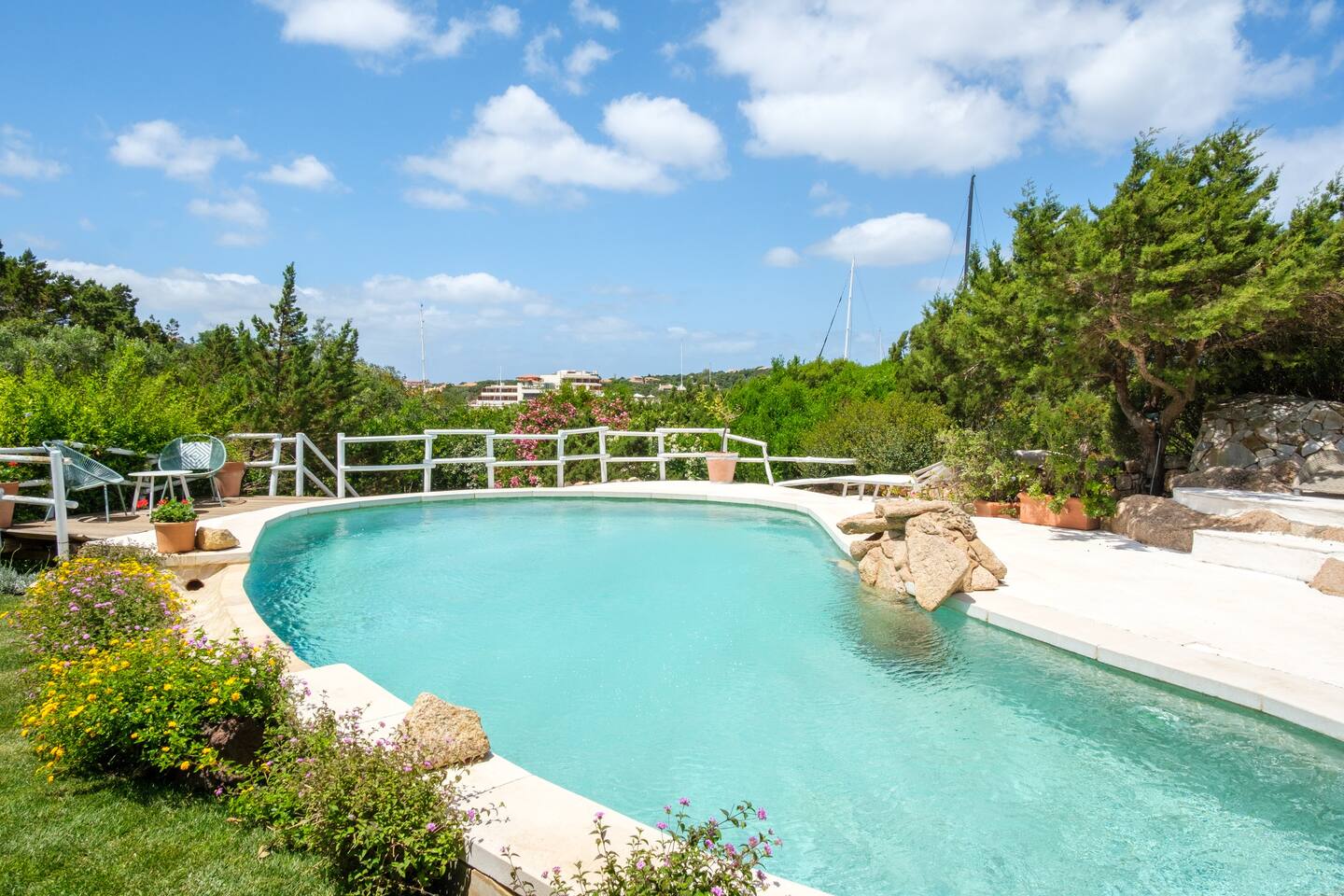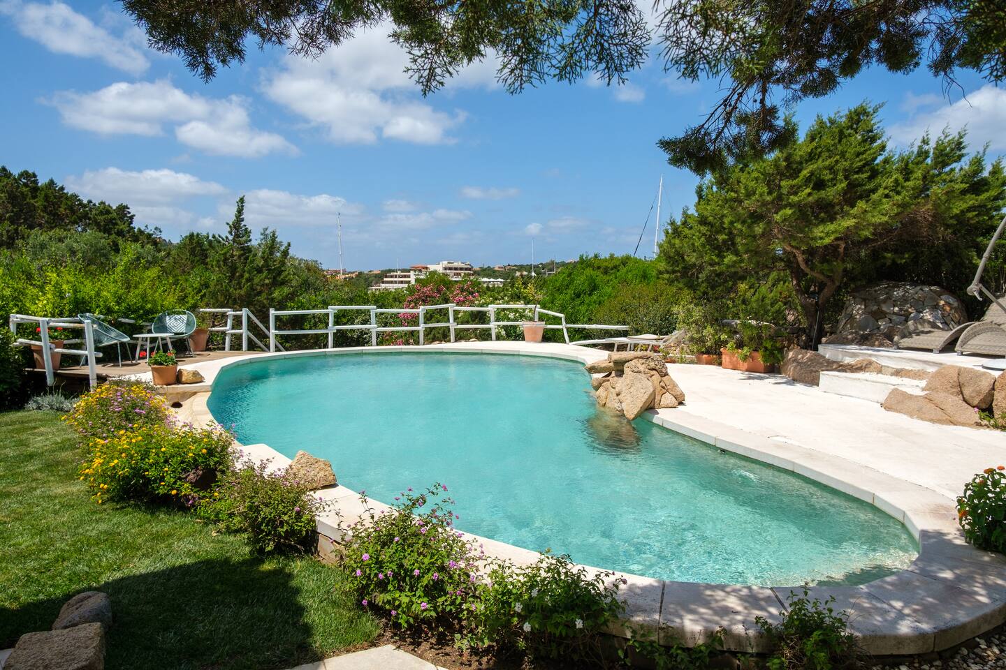 Dal giardino, scendendo dei gradini si accede alla bella piscina privata, circondata dal verde e attrezzata con comodi lettini prendisole per godere in pieno relax il meraviglioso sole della Sardegna.
