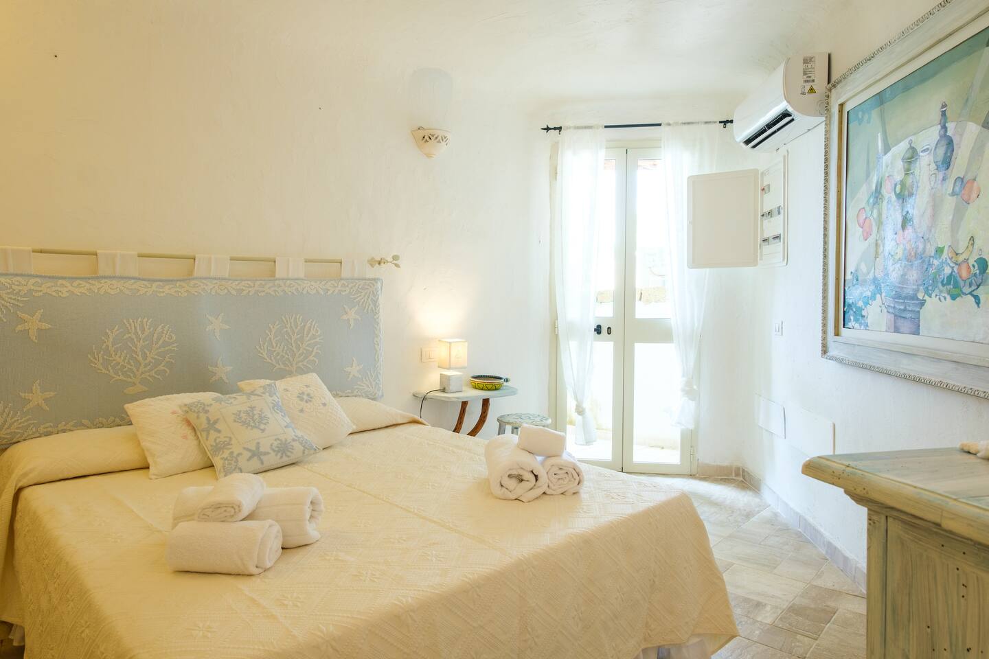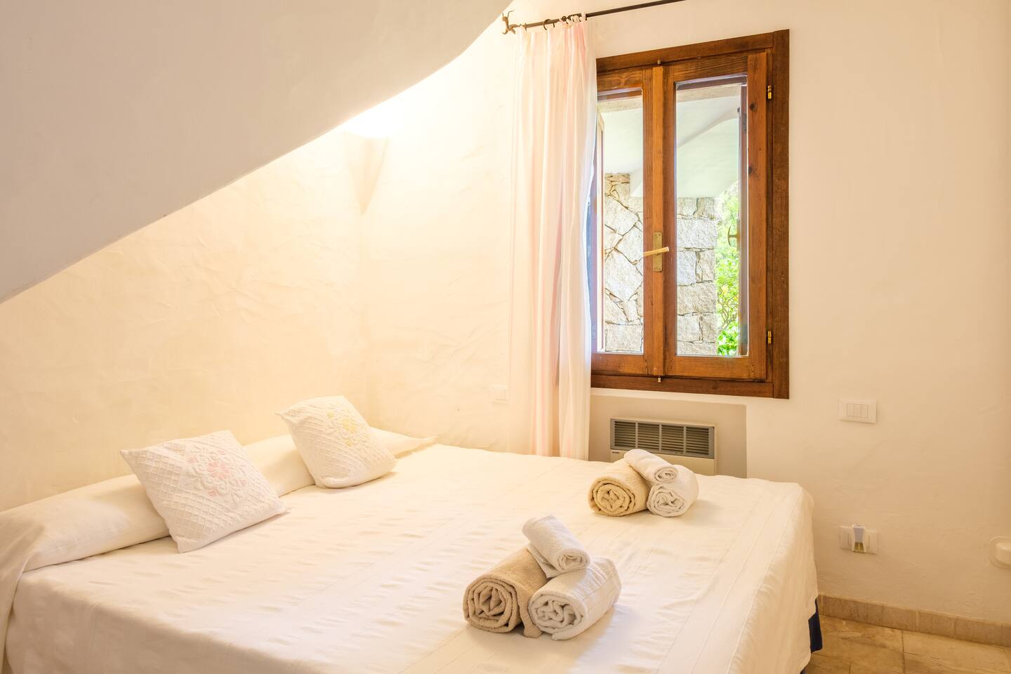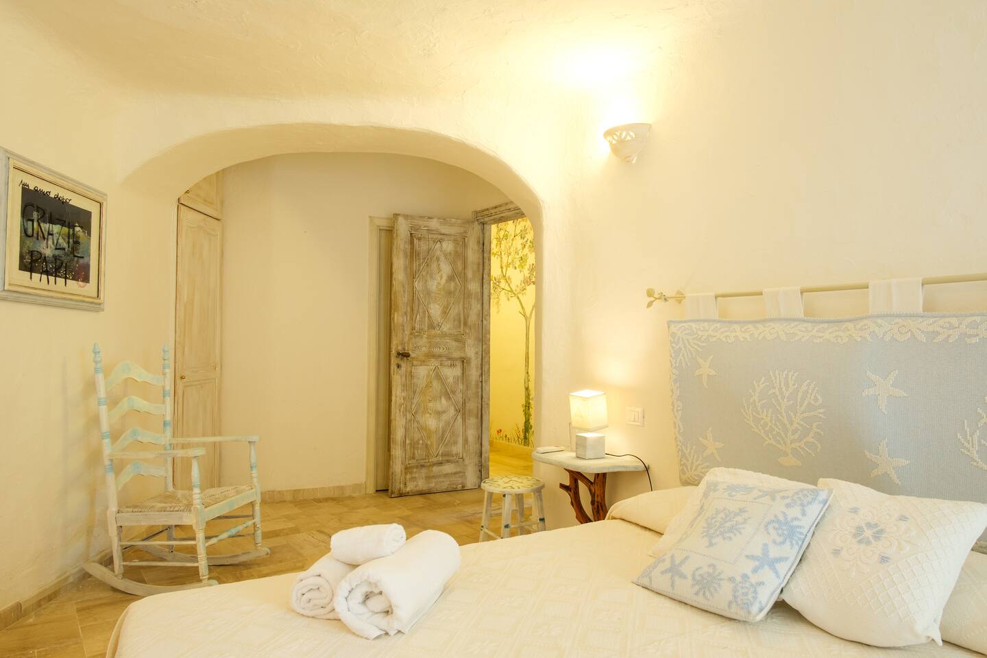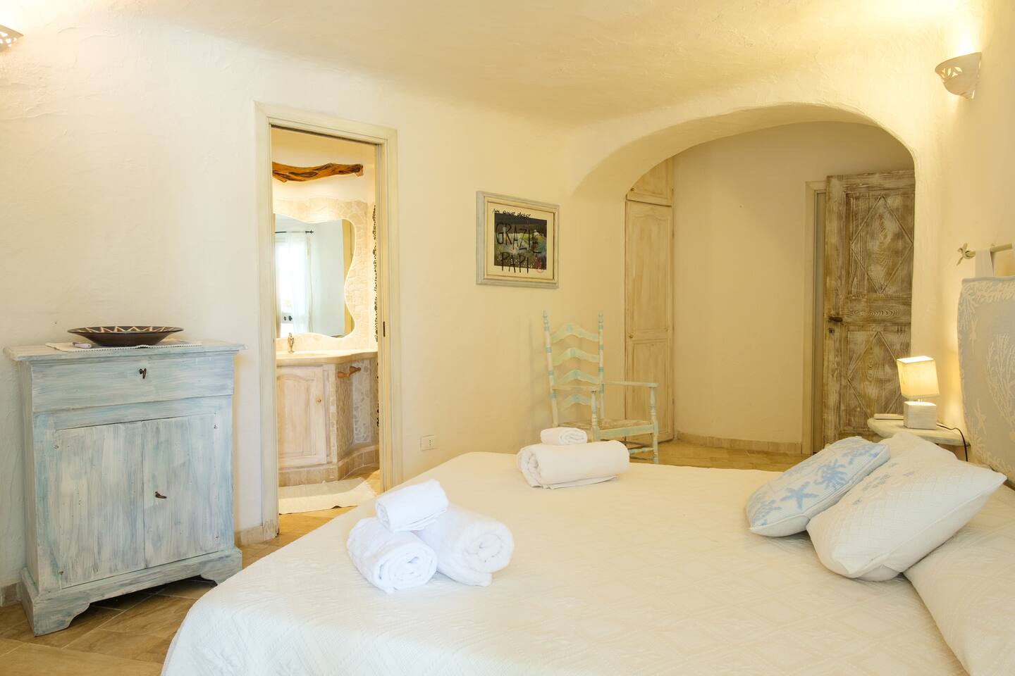 La zona notte si trova al piano sottostante e si compone di 4 belle camere matrimoniali di cui due hanno accesso diretto al giardino e dispongono di bagno ensuite con finiture di pregio come rivestimenti in pregiato Marmo di Orosei e ceramiche della Cerasarda. ..