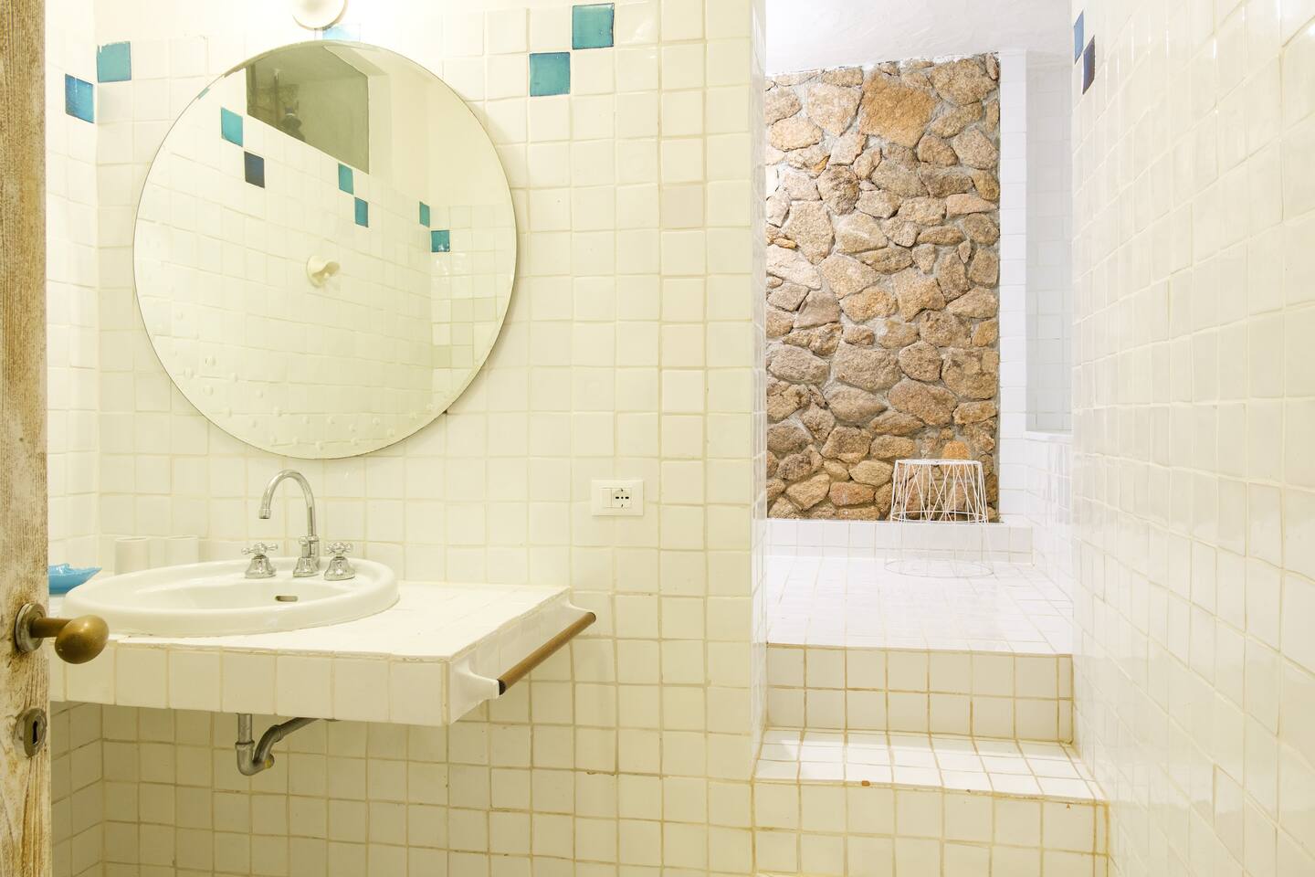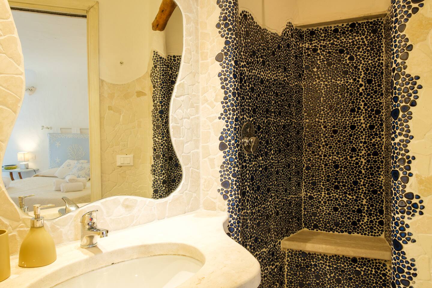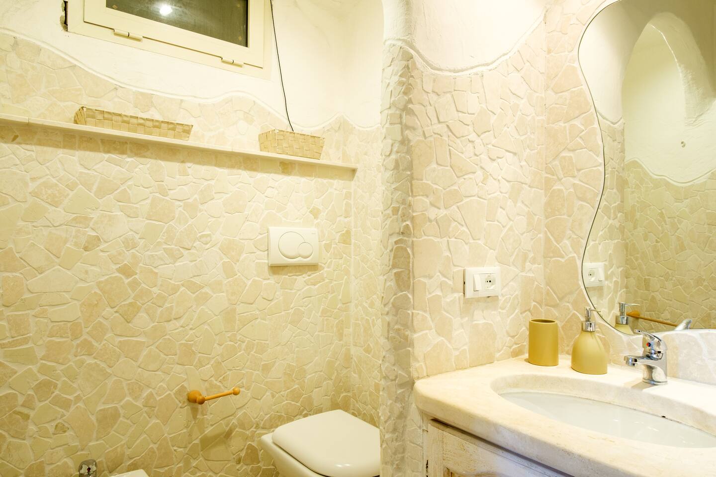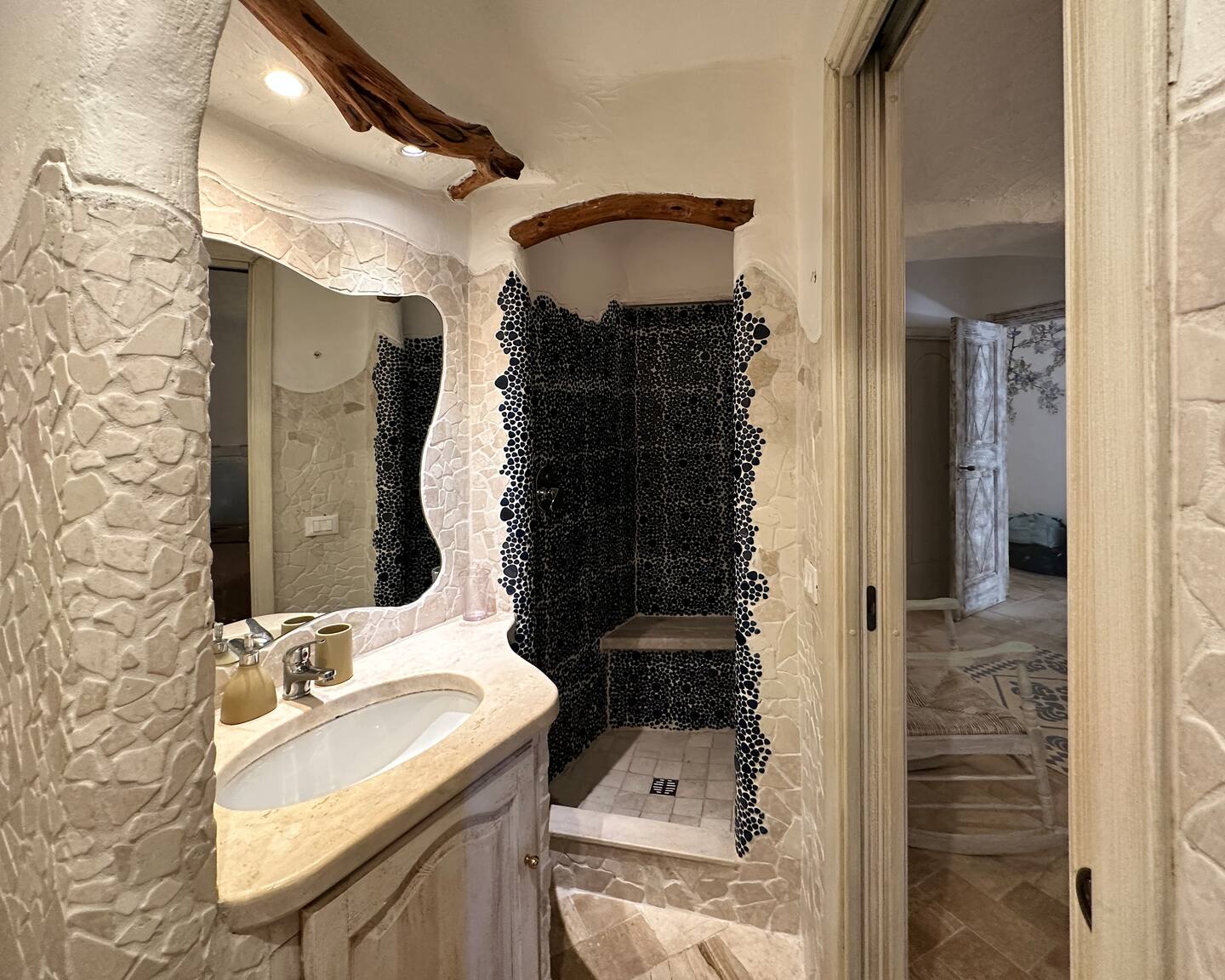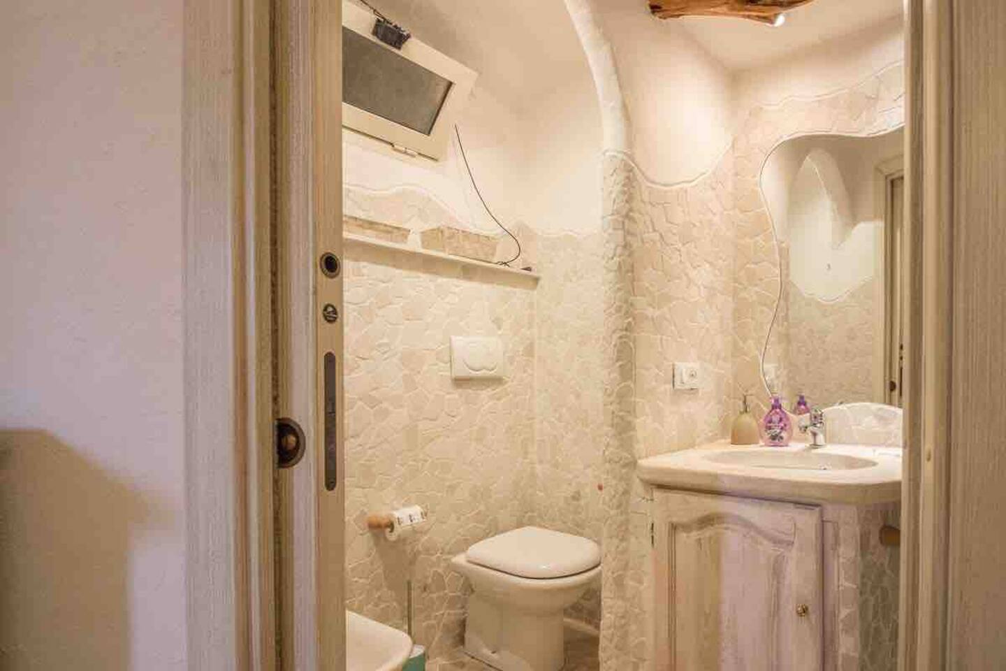 Il terzo bagno presente nella zona notte presenta una particolare parete di roccia naturale e dispone di doccia/vasca, lavabo, wc e bidet.