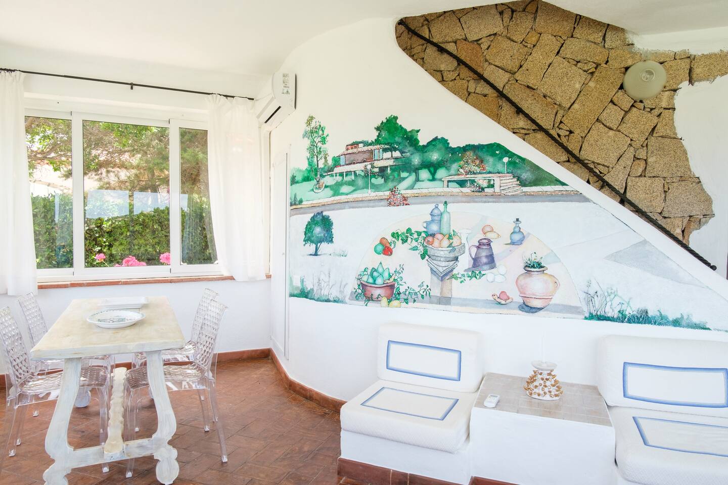 Al piano terra troviamo un’ ampia zona living, ricca di vetrate che donano all’ambiente tanta luminosità e una splendida vista sul mare, grandi salotti, pregiati pavimenti in cotto e pareti affrescate da un bravissimo artista.