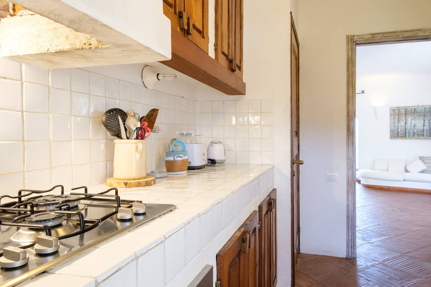 Adiacente la zona living si trova la cucina, completamente attrezzata con piano cottura, frigorifero, freezer, forno, lavastoviglie, microonde, macchina del caffè, bollitore, tostapane e set di utensili completo. ……..